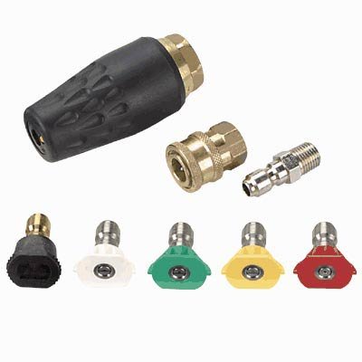 Includes 0deg , 15deg , 25deg , 40deg and 65deg soap nozzles and a turbo nozzle that moves 3.2 GPM at 3000 PSI. With 1/4in. quick disconnect socket and plug. Size (in.): 4.0, Thread Size (in.): 1/4, Degree of Angle ( deg ): 0, 15, 25, 40, 65