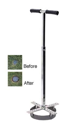 Overgrown grass around irrigation heads or yardage markers can be a real problem. Standard Golf's Irrigation Head Trimmer solves this problem quickly and easily. It cuts a clean edge around irrigation heads, quick couplers or fairway yardage marks.Removes roots for long lasting grass control. Cutting band can be adjusted one time to precisely fit your needs. Polished stainless steel construction. Comes with detailed instructions to aid in adjustment and operation. Size: 32" height, one time adjustment from 4" to 11" diameter cut.