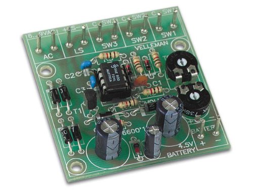 This electronic chime generates three different available chime tones, which can be selected by individual switch closures. Perfect for replacing that old doorbell buzzer or bell and can handle three separate door sounds! The IC design provides a clean audio output of a third of a watt into any standard 8 ohm speaker (not included). The circuit runs on 4.5VDC (three 1.5V batteries, not included) or 6 to 9VAC which is normally provided by the old doorbell transformers! Just use that if you have one. Terminals are included for three separate switch contacts, speaker output, AC, and 4.5V battery connections. The compact board measures 2.1 x 2.3 and can easily be installed in any suitable location. For a great finished look, order the G416 c...Read more